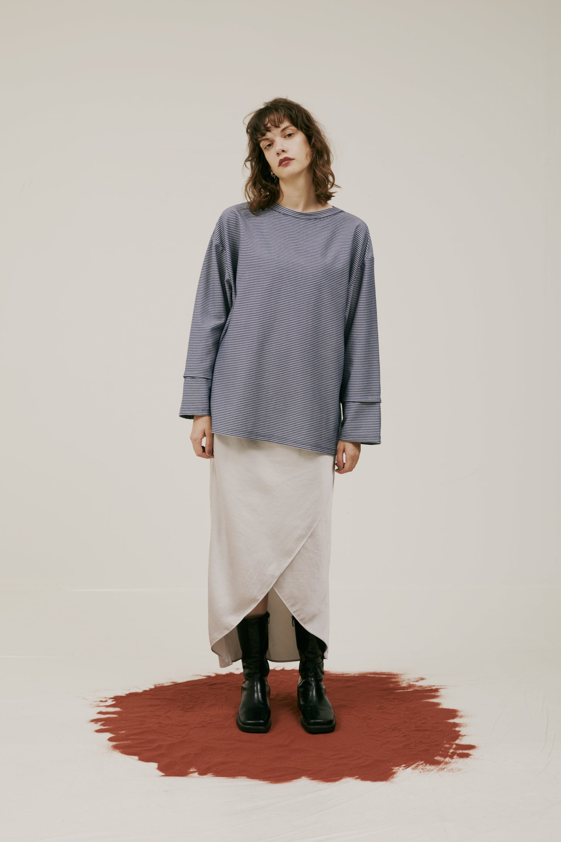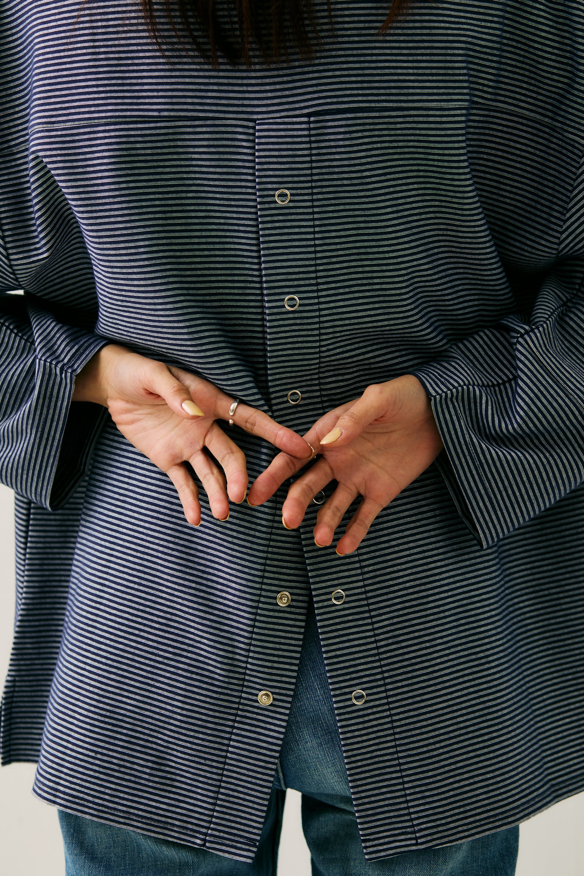 後ろのボタン空き仕様はインナーを見せたスタイリングや、オーバーなシルエットでも小柄な方が開けて着用したときに着られることなく抜け感がでる一枚になるように、ひと手間こだわったディテールです。
