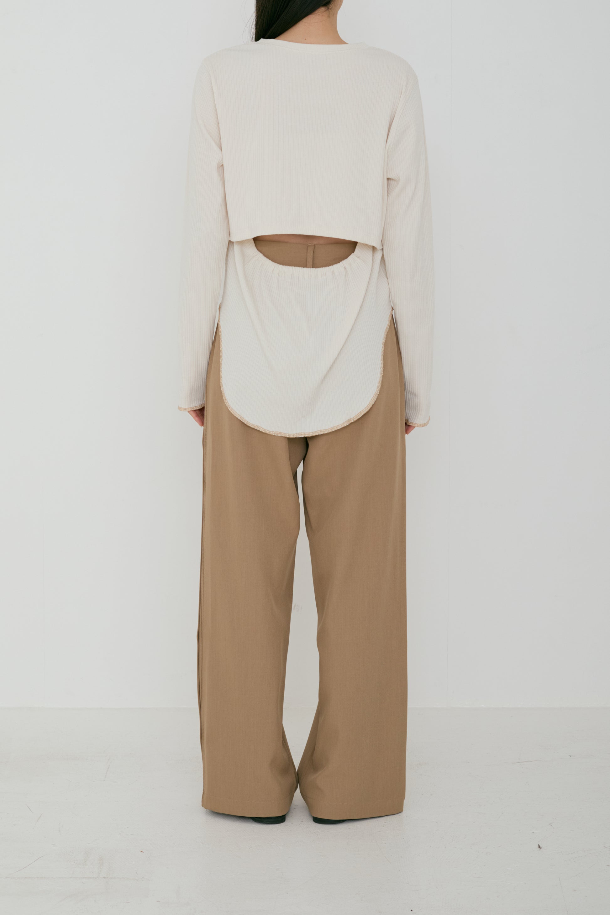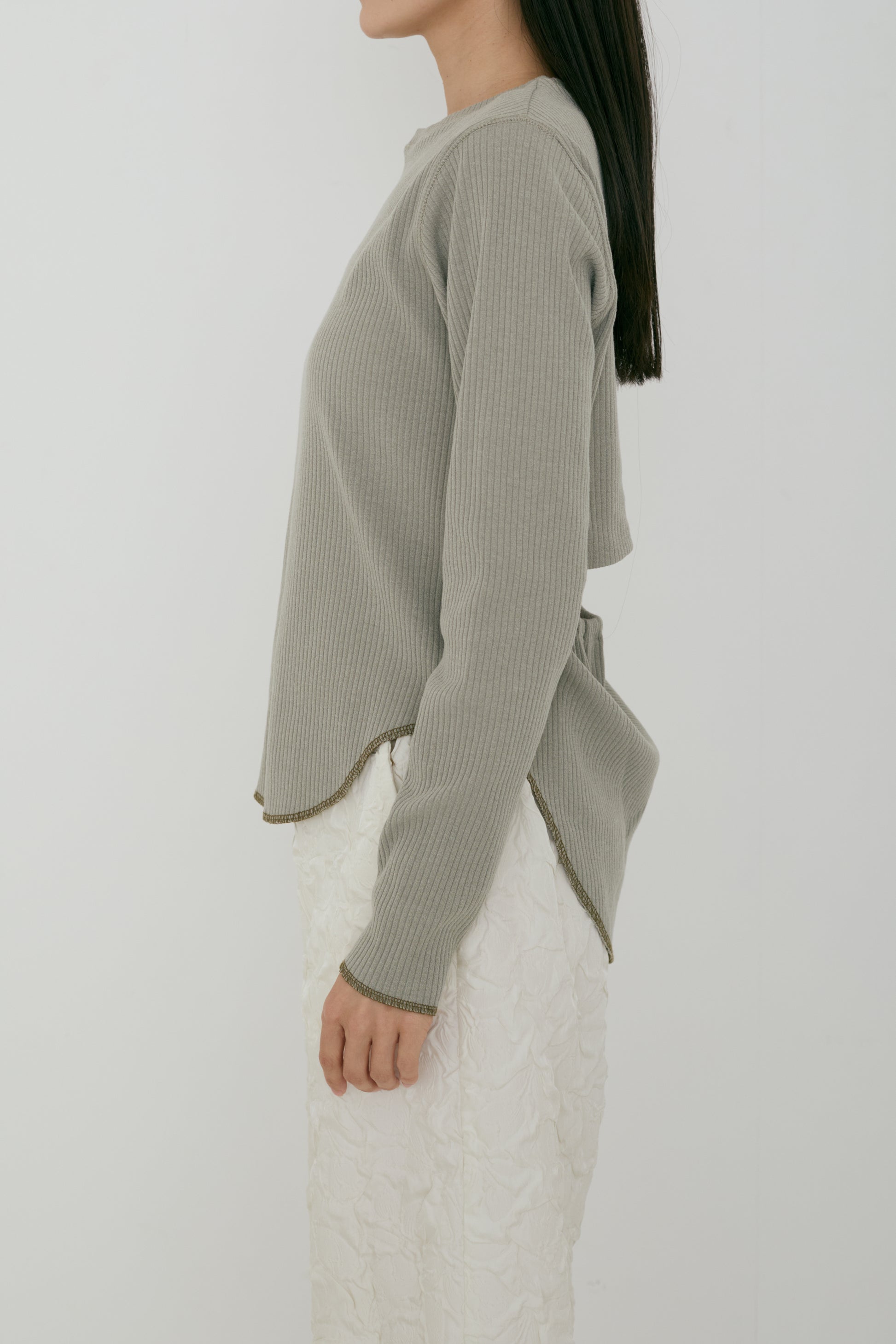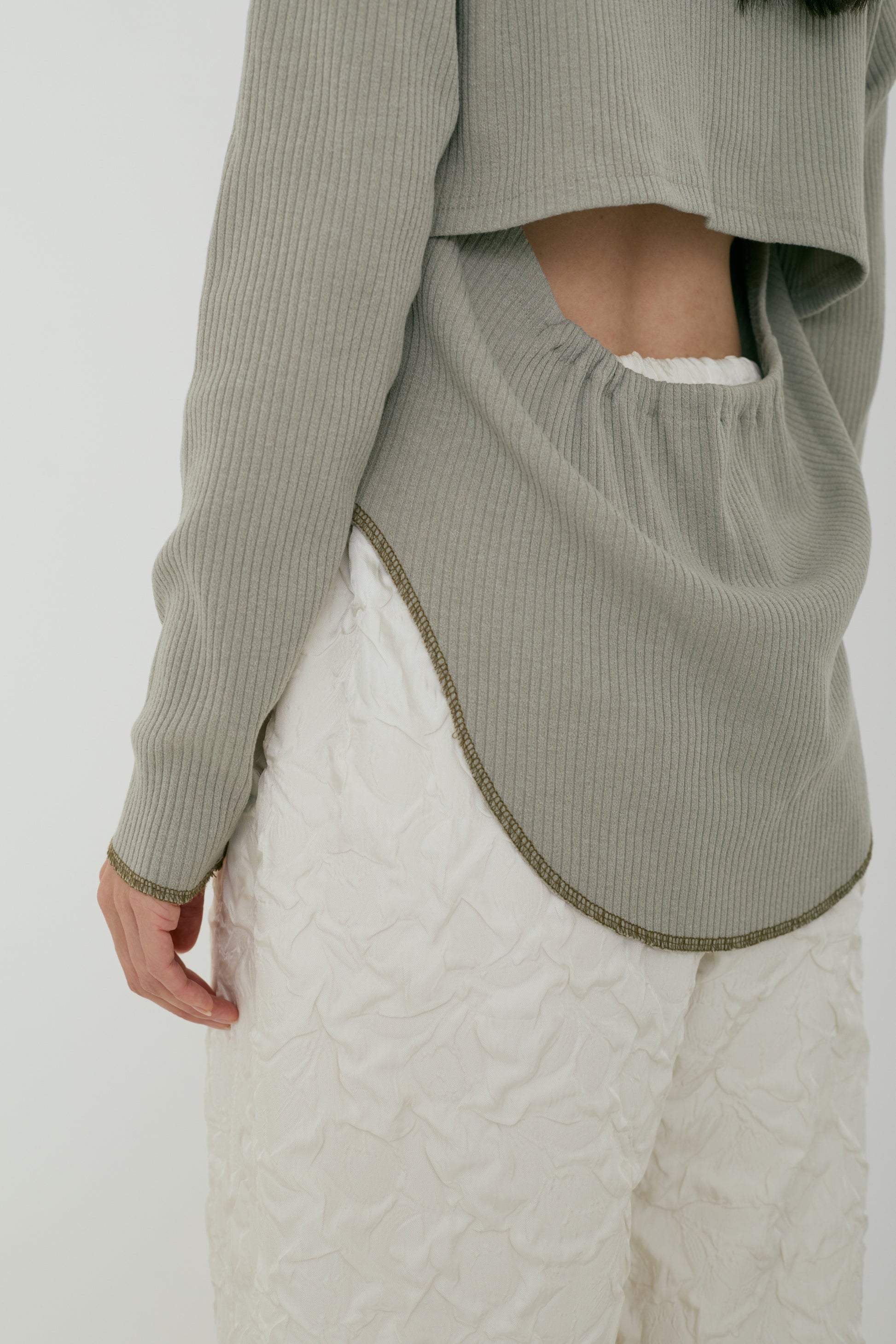 厚みのありリブのカットソーをを使用し、腰部分に空きがあることで下着を気にせずにナチュラルな肌見せが叶う一枚。