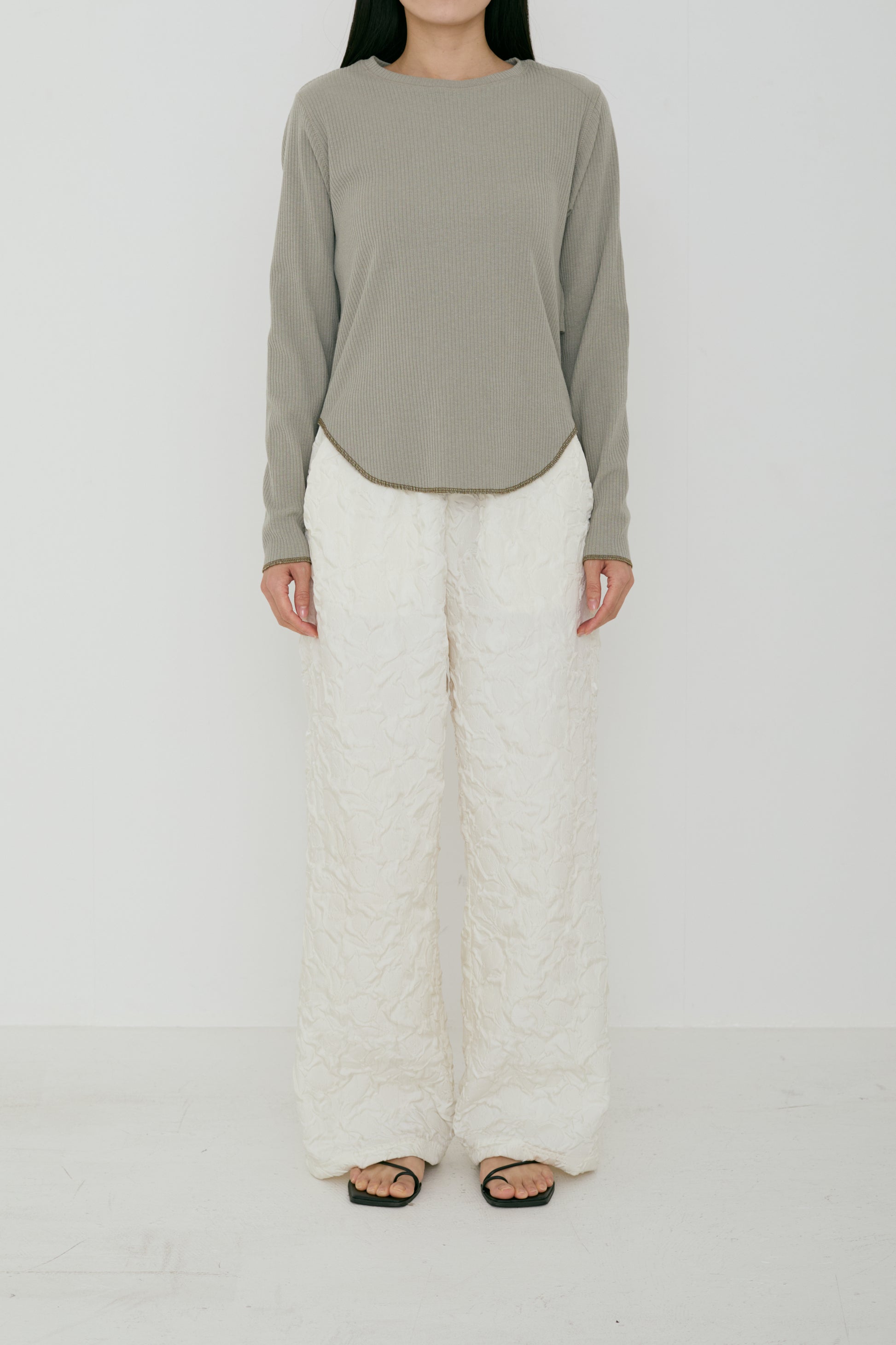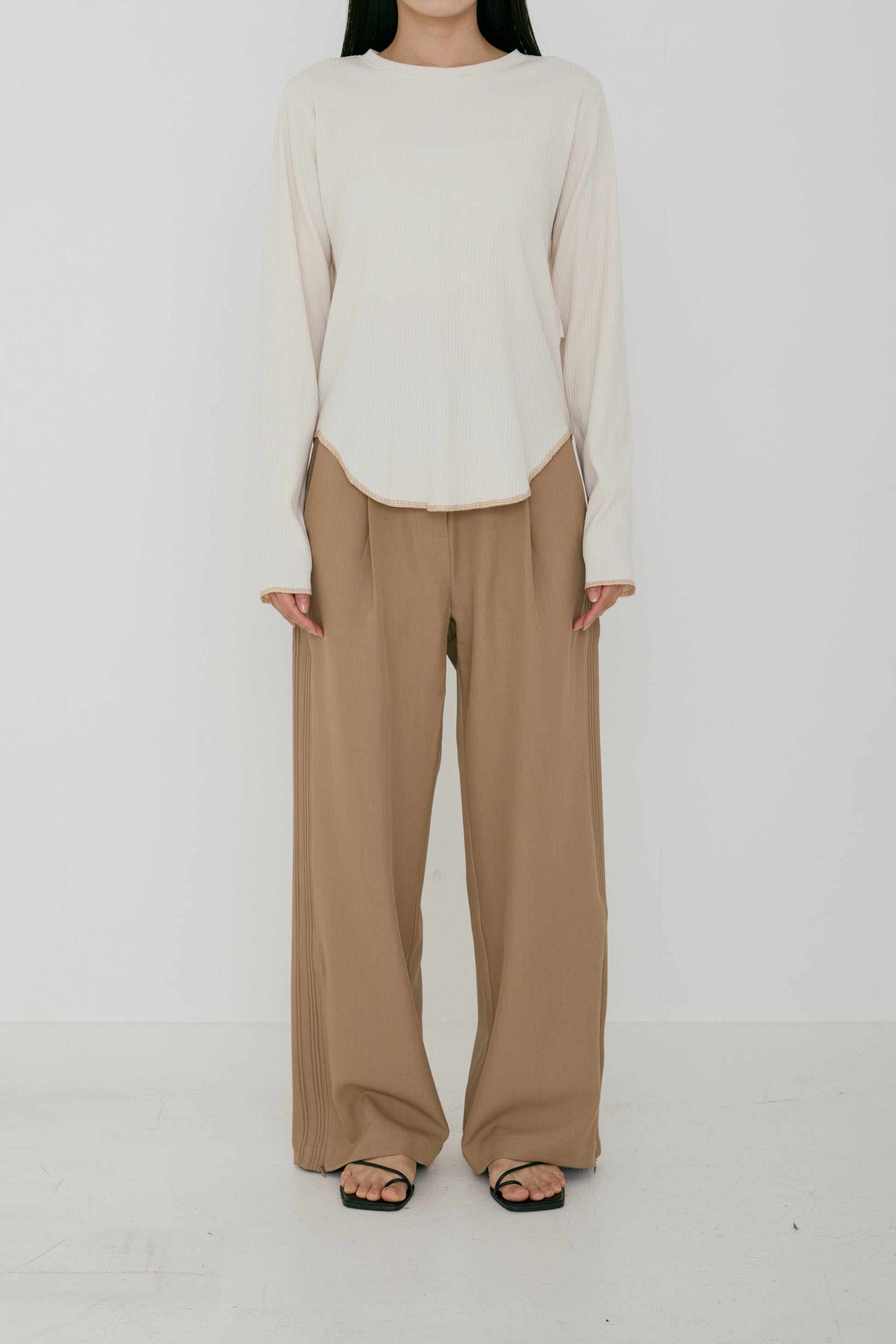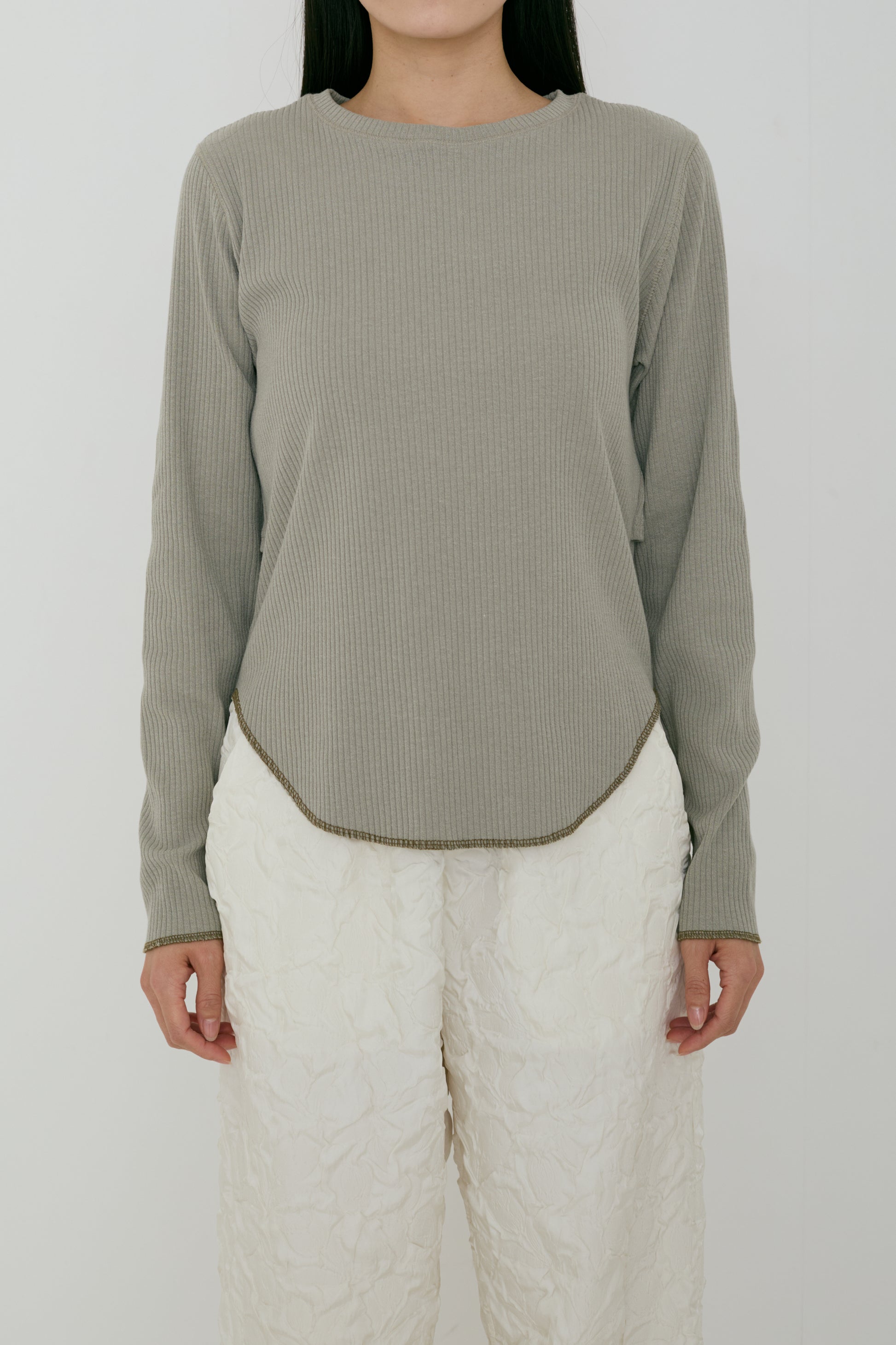厚みのありリブのカットソーをを使用し、腰部分に空きがあることで下着を気にせずにナチュラルな肌見せが叶う一枚。