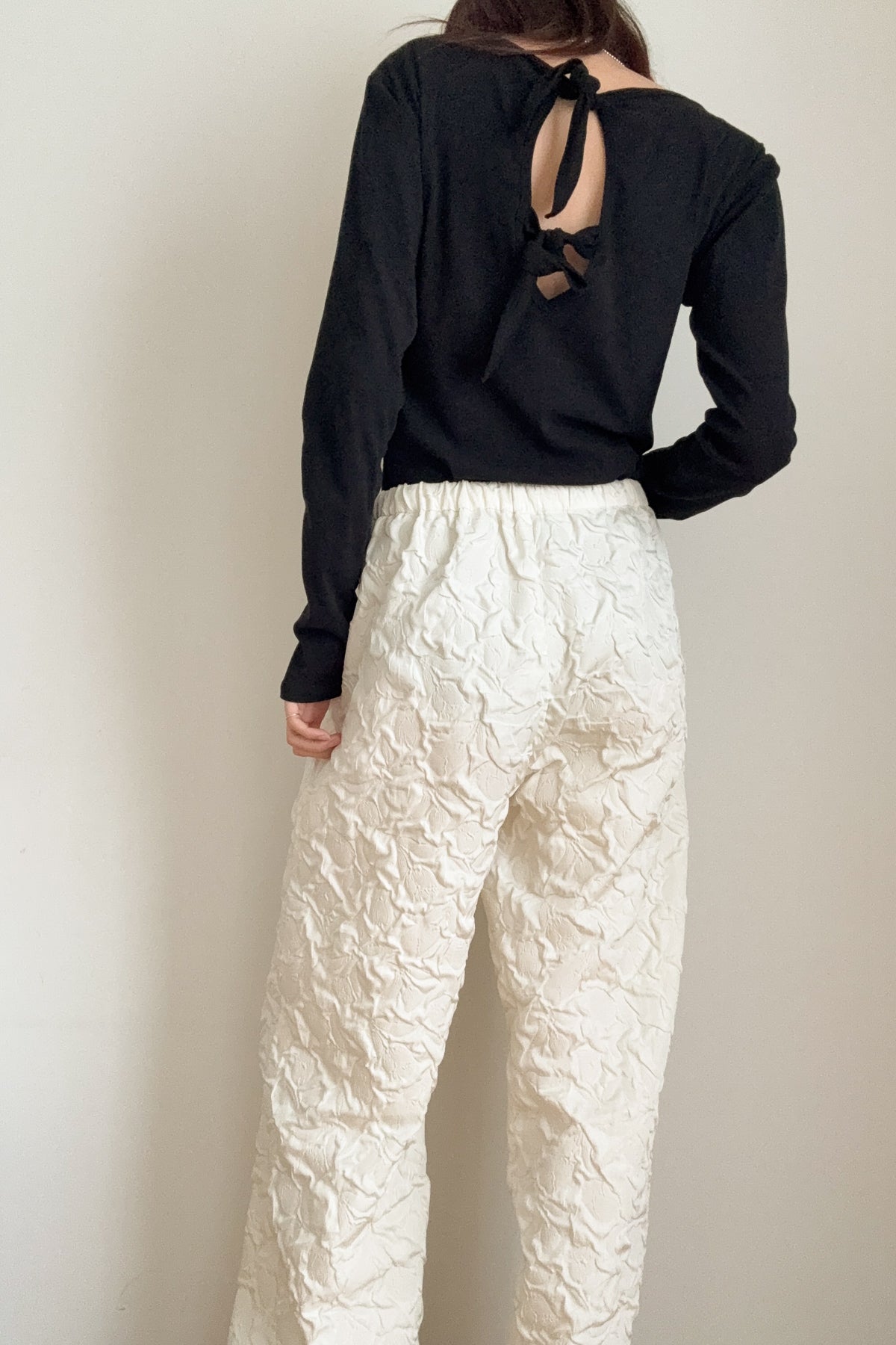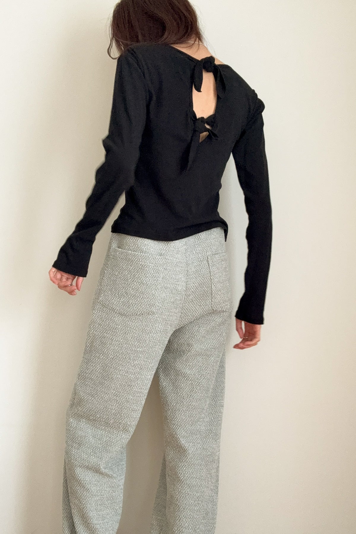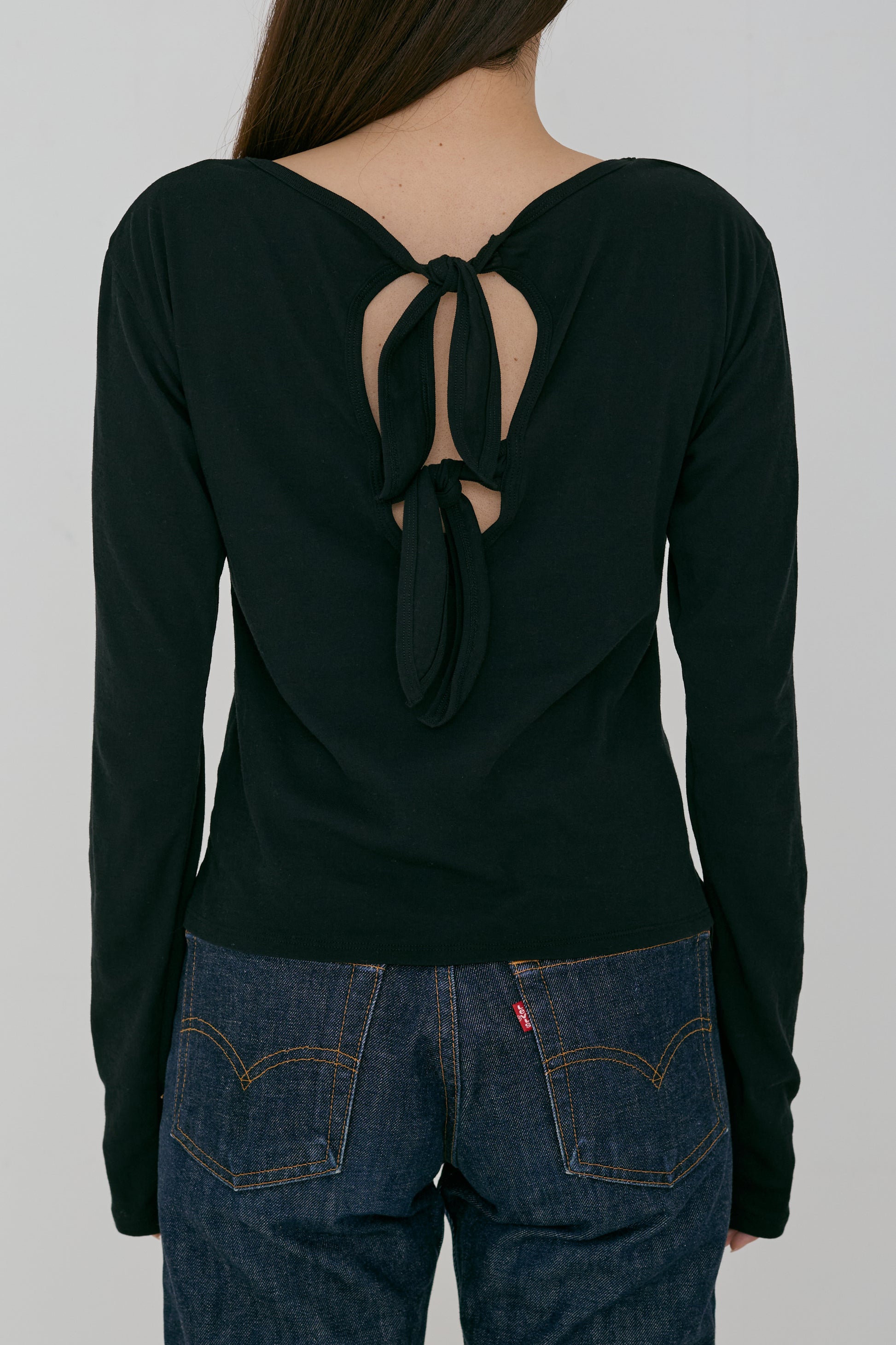 後ろの結びデザインは、結び方次第でフェミニンにも、きれいめにも表情を変えられます。