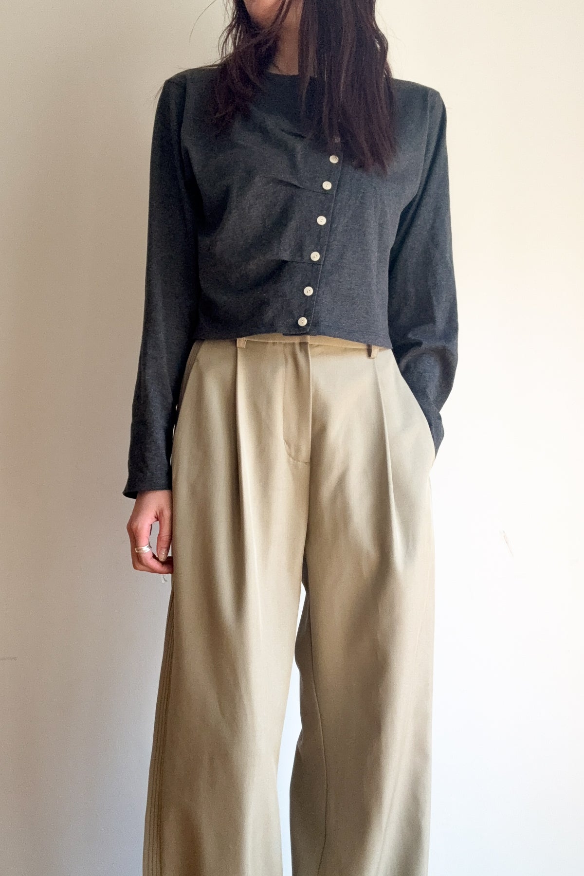 斜めに配した釦デザインが目を惹く、コットン100%のトップス。