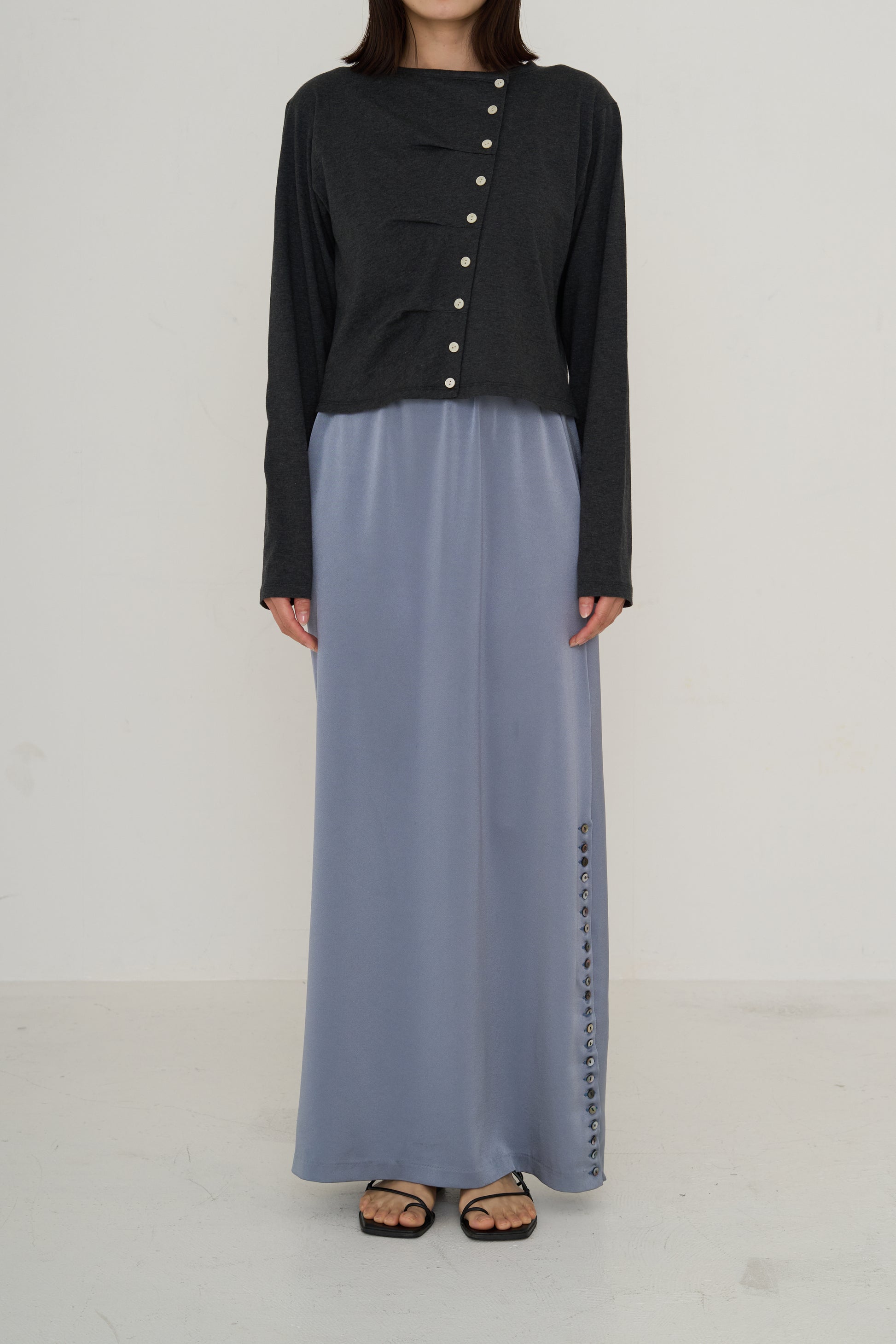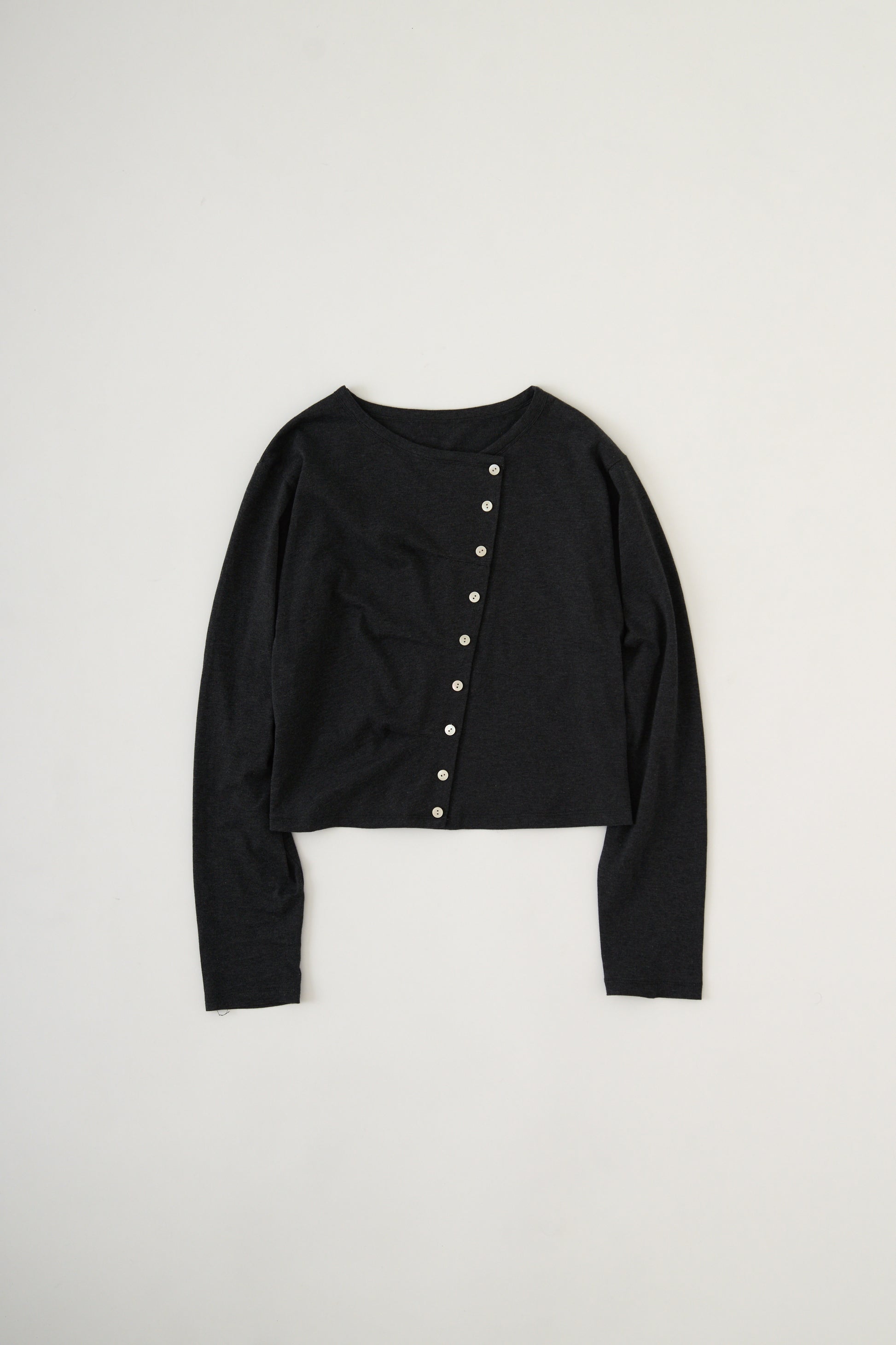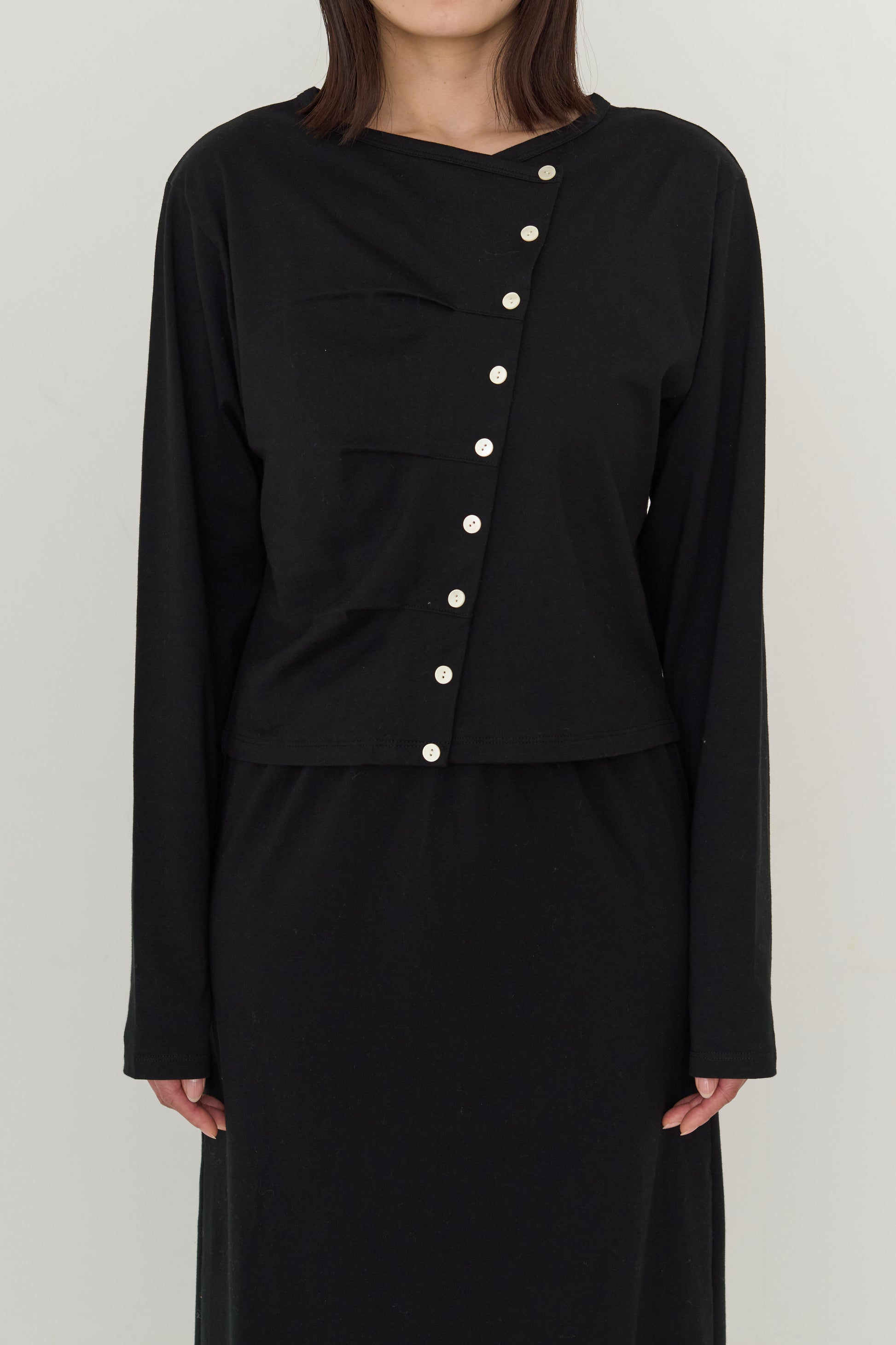 斜めに配した釦デザインが目を惹く、コットン100%のトップス。