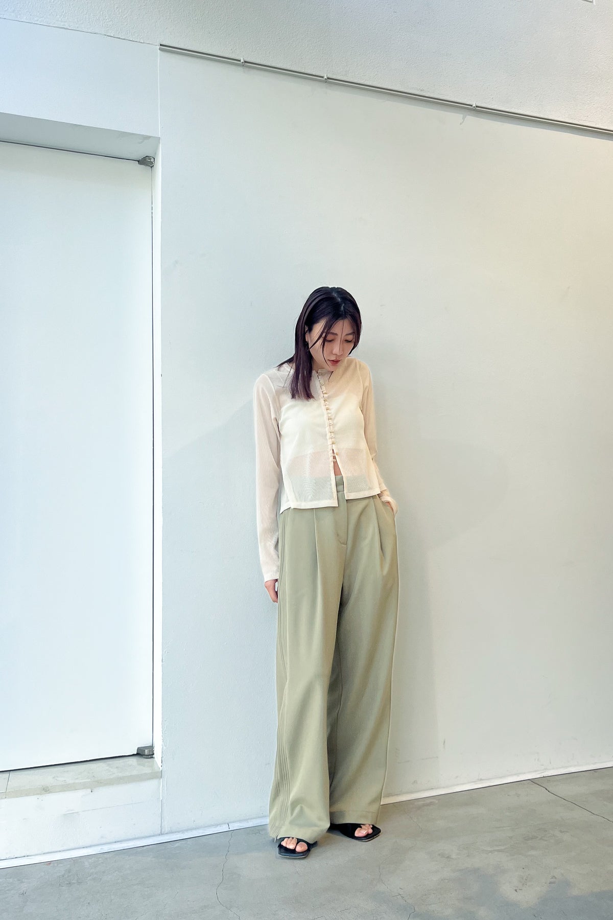 ラッセル編み機でストライプ状にシアー感を出し、編み立てられ通常の横編みに比べてハリがあるため、ドライタッチとシルエットが綺麗に出るのが特徴。