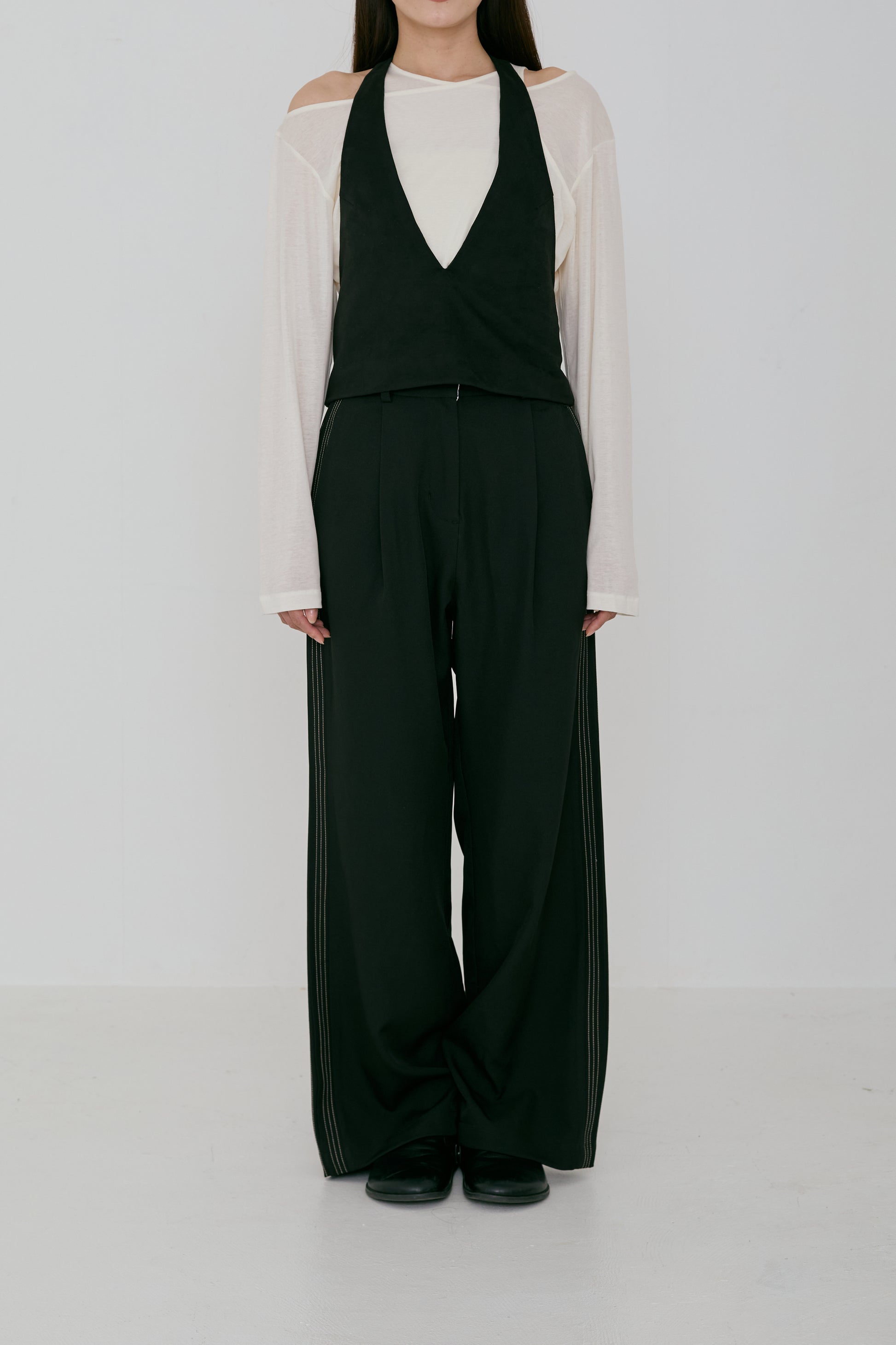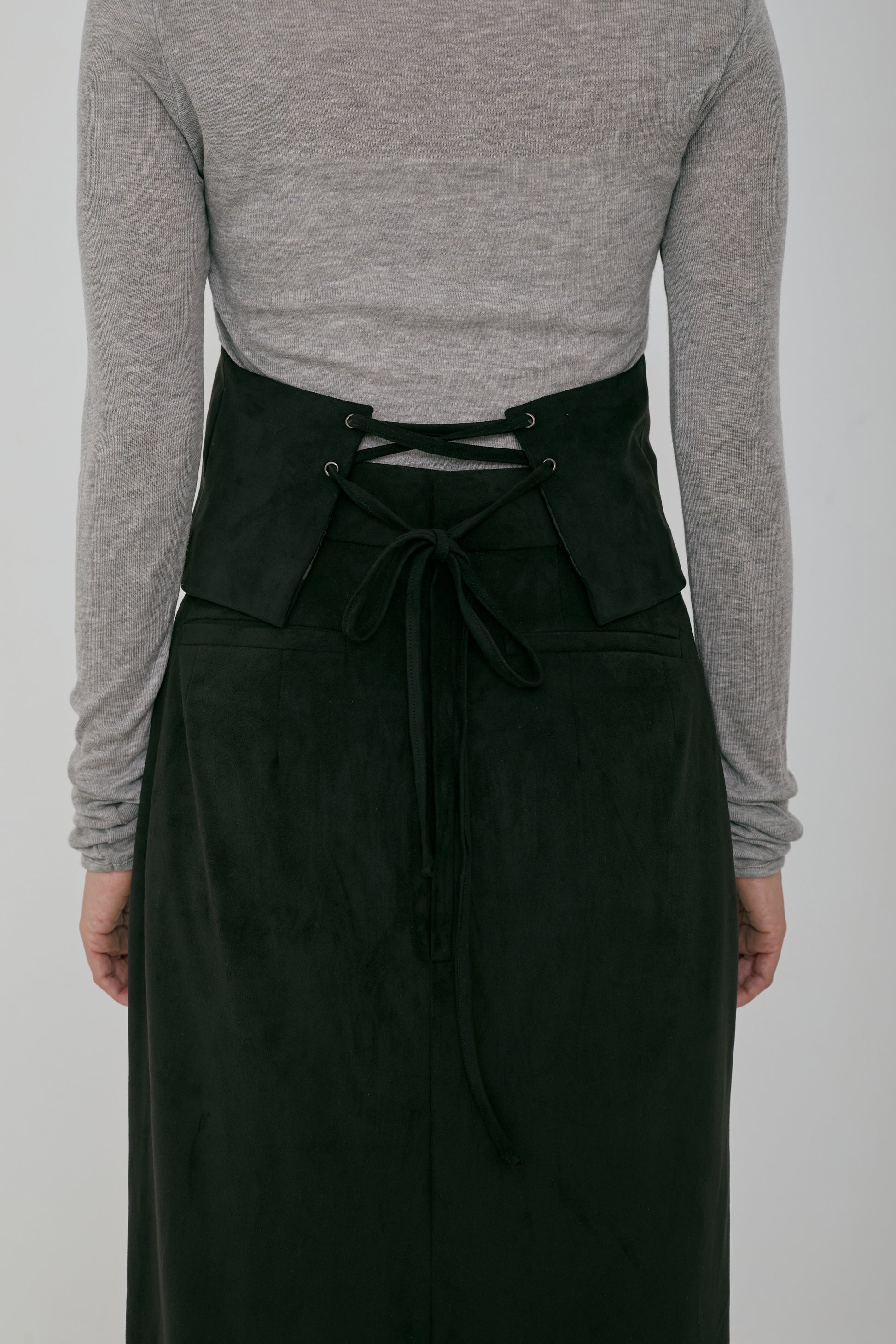 深めのVネックは女性らしいシャープな印象に仕上げ、後ろはレースアップ仕様でシルエットを自在に調整でき、コルセットをイメージしたディティールに。