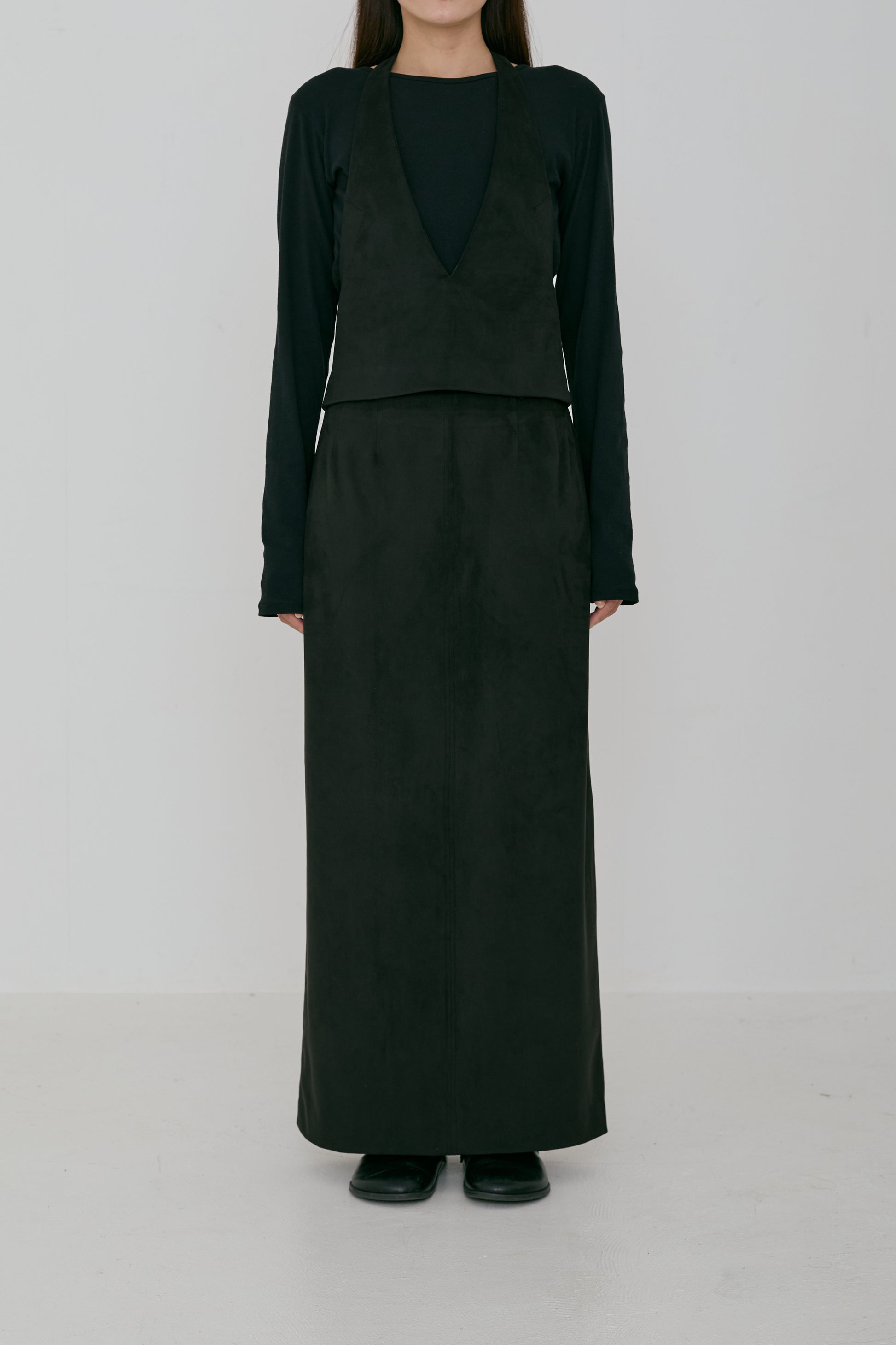 同素材のCut-out suede skirtと合わせたセットアップスタイルもおすすめです。
